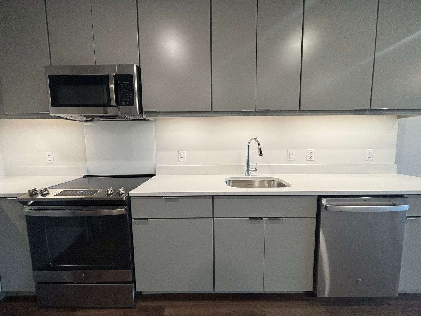 -Maple Hardwood Cabinetry: Featuring a “Cloud” Grey finish with polished chrome pulls and undercabinet lighting for a modern touch.