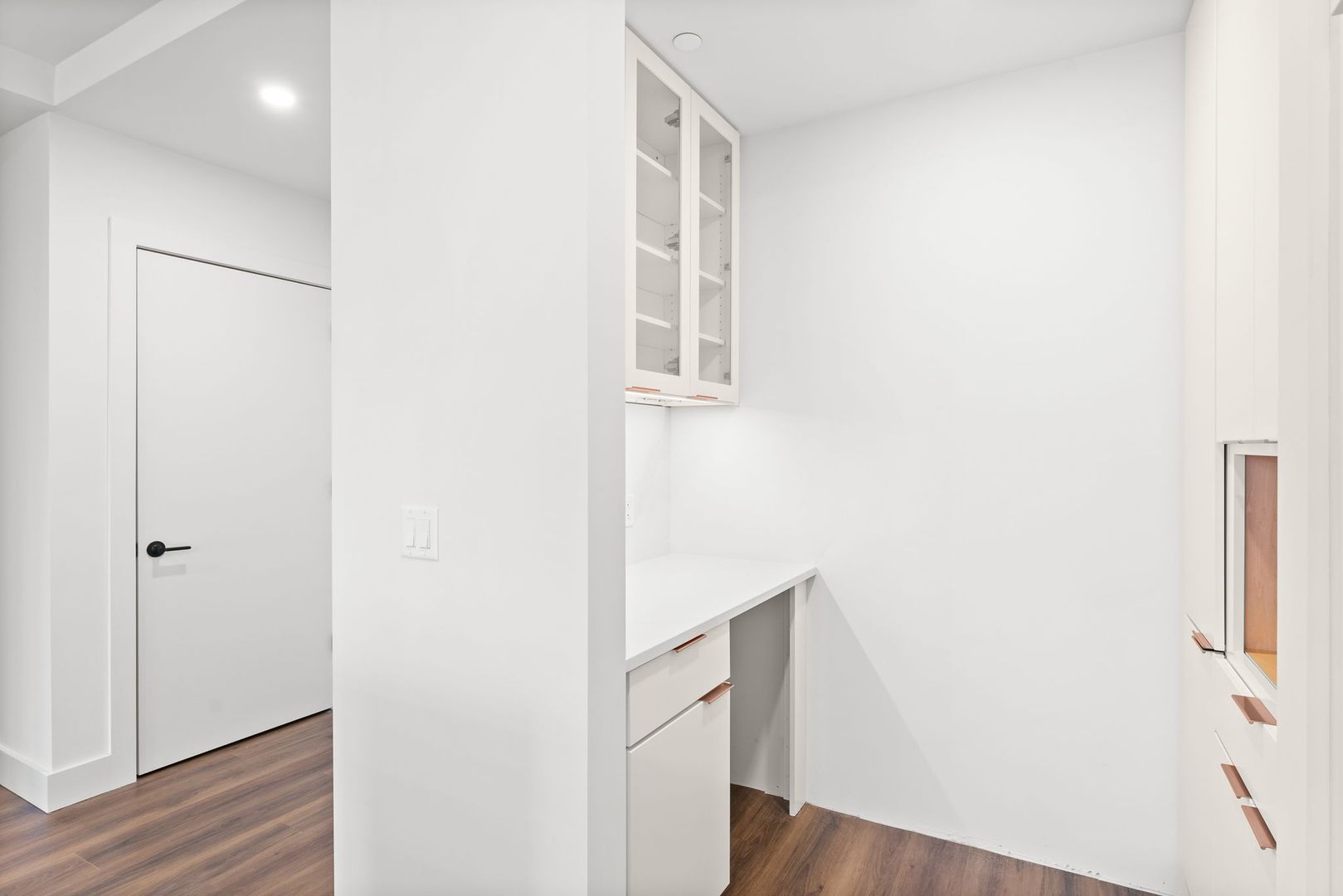 The chef-inspired kitchen showcases white cabinetry, a striking black walnut island with gold pulls, induction range, generous pantry, and a built-in beverage center—perfect for entertaining. Additional highlights include a fireplace, remote-controlled window blinds, washer/dryer in bath, and custom closets by Lake Champlain Closet Co. Sophisticated, sunlit, and thoughtfully appointed, Unit 503 delivers modern luxury in the heart of Burlington.