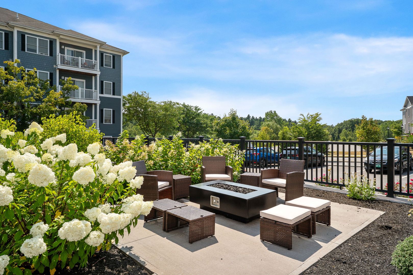 Residents enjoy community amenities including a fitness center, outdoor gathering spaces with grills and firepit, landscaped green areas, and a pet-friendly environment with on-site management.